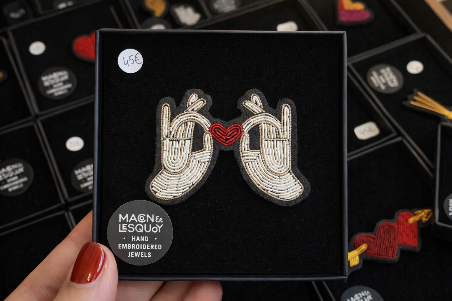 Une broche délicatement brodée autour du thème de l’amour, pour offrir un petit symbole chic et plein de caractère à porter près du cœur 💘✨