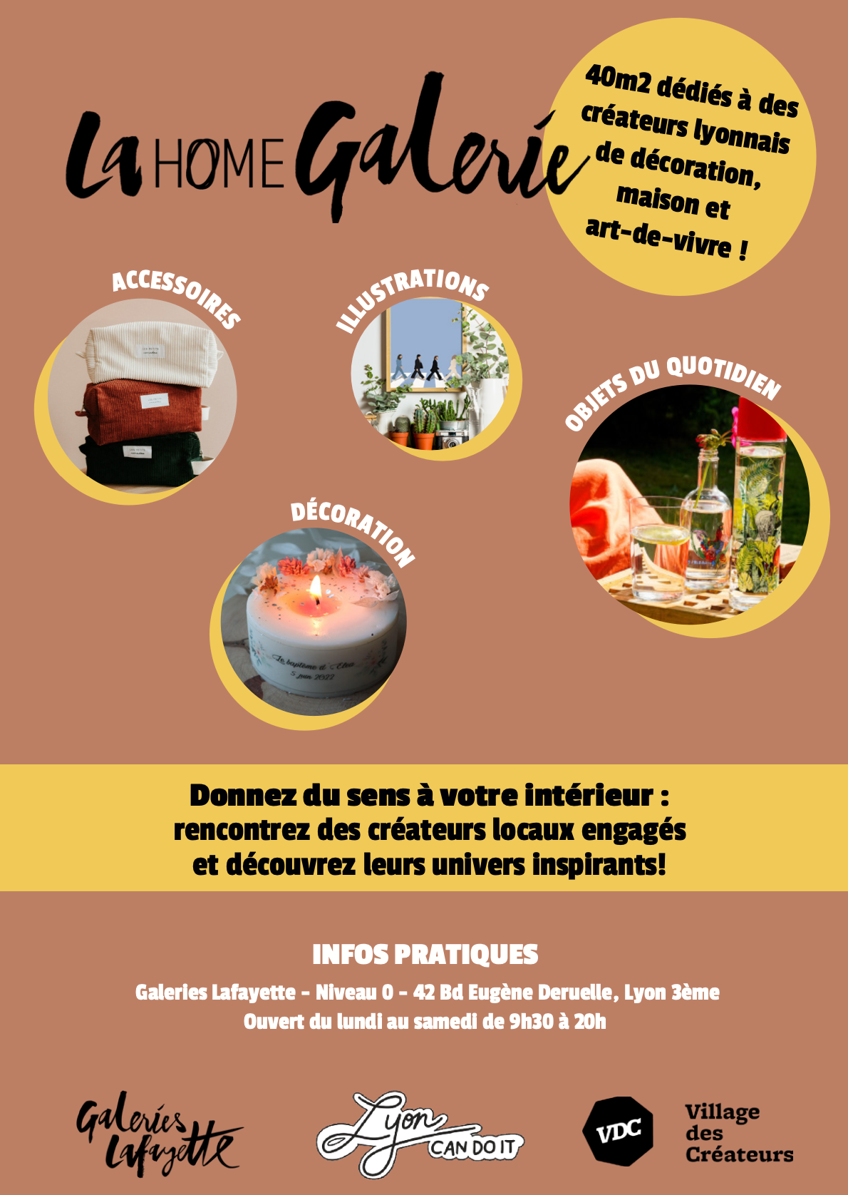 Du 6 septembre 2021 au 31 juillet 2023, vous avez pu découvrir des créateurs de la team Lyon Can Do It, dans le corner de la Home Galerie aux Galeries Lafayette de Lyon Part-Dieu, aux côtés de Coney Cookies et LJ. Merci à Véronique, Alexandra et toute l’équipe des Galeries pour leur confiance.